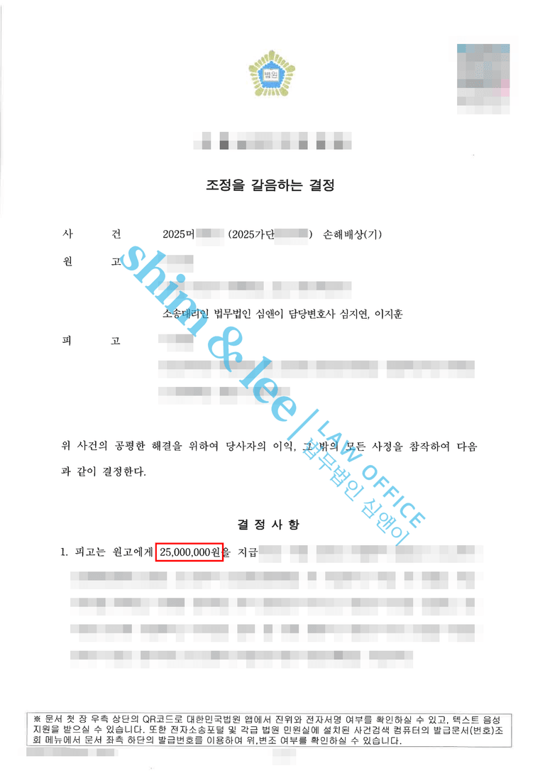 - 재판부는 결국 심앤이의 뜻에 따라 의뢰인에게 유리한 조건을 모두 담은 강제조정을 내려주었습니다. 2,500만 원 지급 외에도 단순한 금전 보상에 그치지 않고, 비밀유지 의무와 접근금지, 위약벌 조항까지 세세하게 포함시켜 의뢰인의 권리를 온전히 반영한 결정을 받게되었습니다.