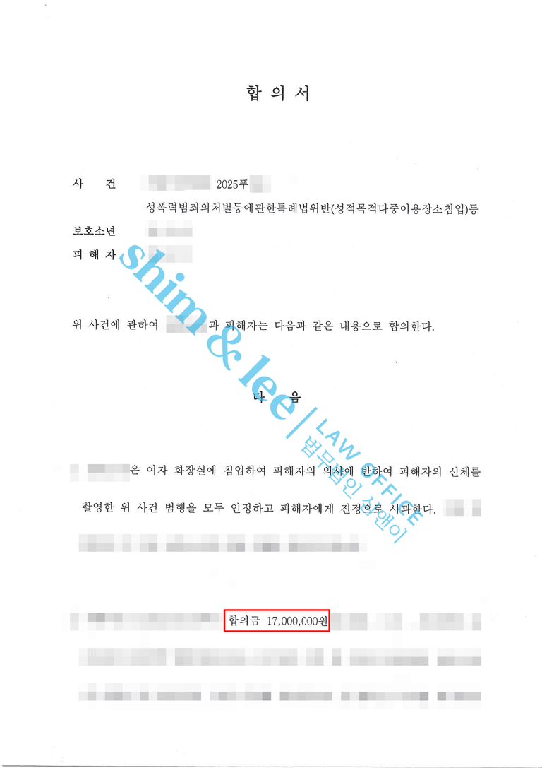 - 심앤이의 강경한 태도에 당황한 가해자 측은 합의금을 빠르게 최대한으로 마련할 것을 약속하며 간곡하게 합의 요청을 이어갔습니다. 결국 가해자 측은 처음 제안한 500만 원에서 3배 넘게 증액된 1,700만 원을 일시납 하겠다며 최종 합의금으로 제시하였고, 극적으로 합의가 성사되었습니다. 더하여, 대표 변호사님은 불법촬영범죄인만큼 촬영물미소지, 비밀유지, 접근금지, 소제기금지 등 부가조항을 덧붙여 의뢰인에게 유리하도록 합의서를 꼼꼼히 작성하였습니다.