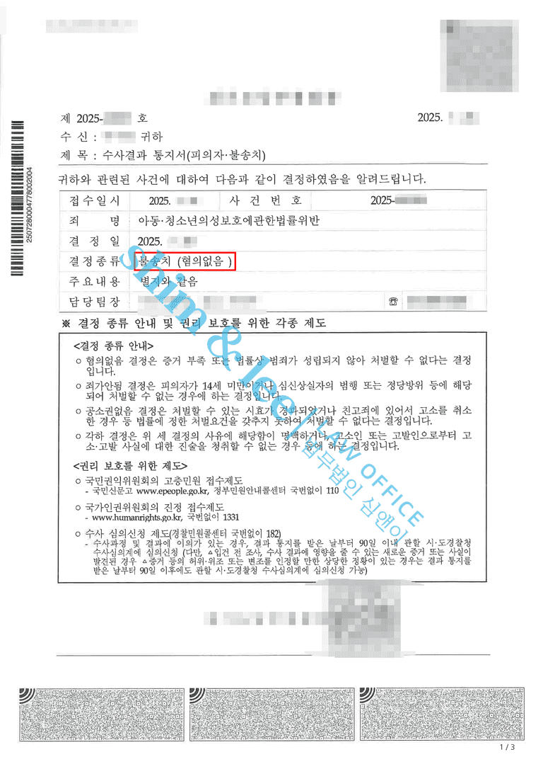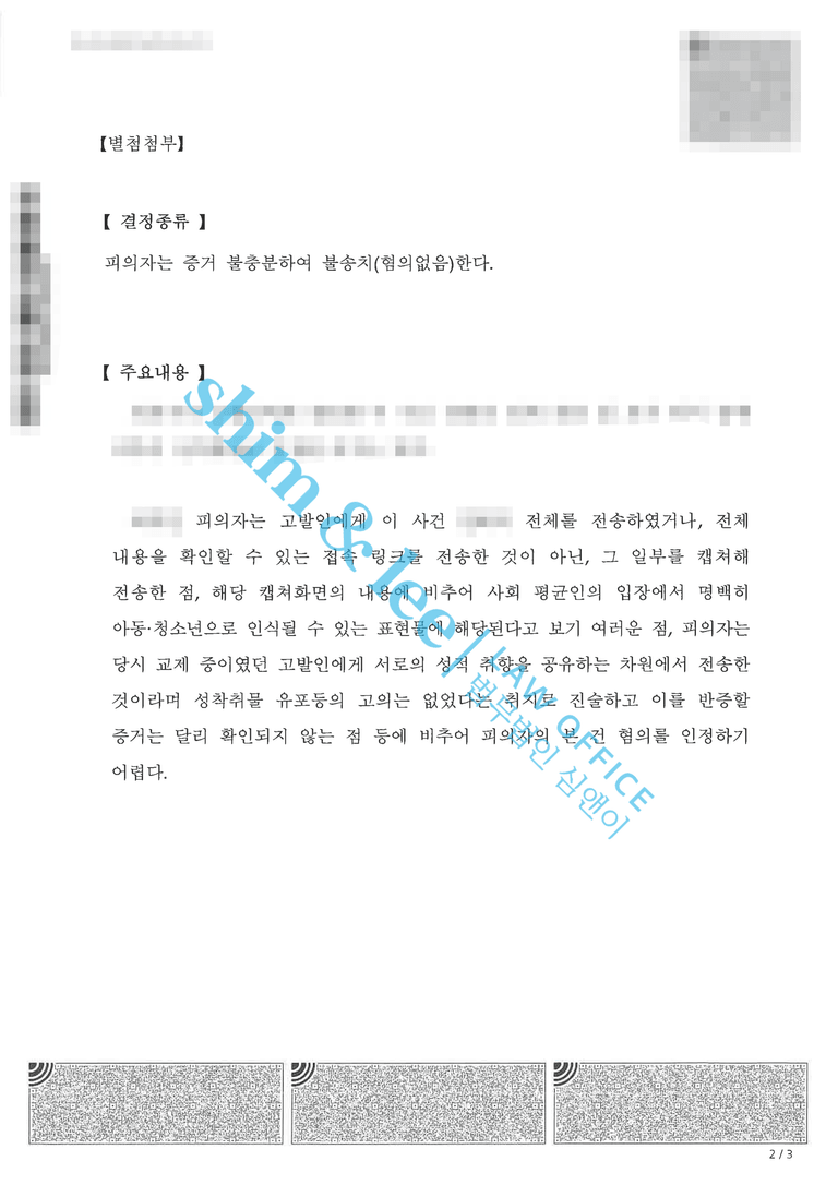 -심앤이의 노력 덕분에 담당 수사관으로부터 아동•청소년의 성보호에 관한 법률 위반에 해당하지 않는다는 점을 인정받아 혐의없음으로 불송치 처분을 받아냈습니다.