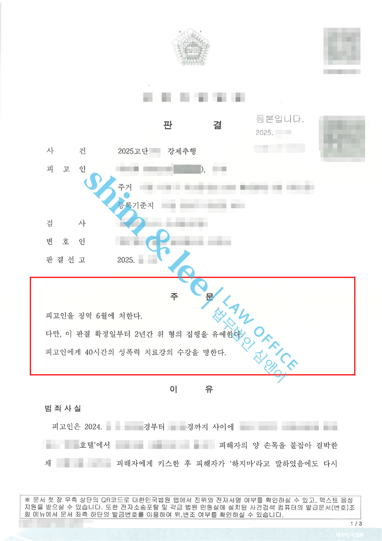 -이후 재판부는 가해자가 합의를 했음에도 불구하고 징역 6월, 집행유예 2년, 성폭력 치료 강의 40시간의 판결을 선고하였습니다.