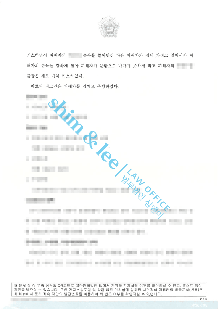 -의뢰인은 옷이 흐트러진 채 침대에 누워있었고, 가해자는 의뢰인의 가슴을 만지며 추행하고, 저항하는 의뢰인을 제압하며 억지로 키스를 시도하였습니다.