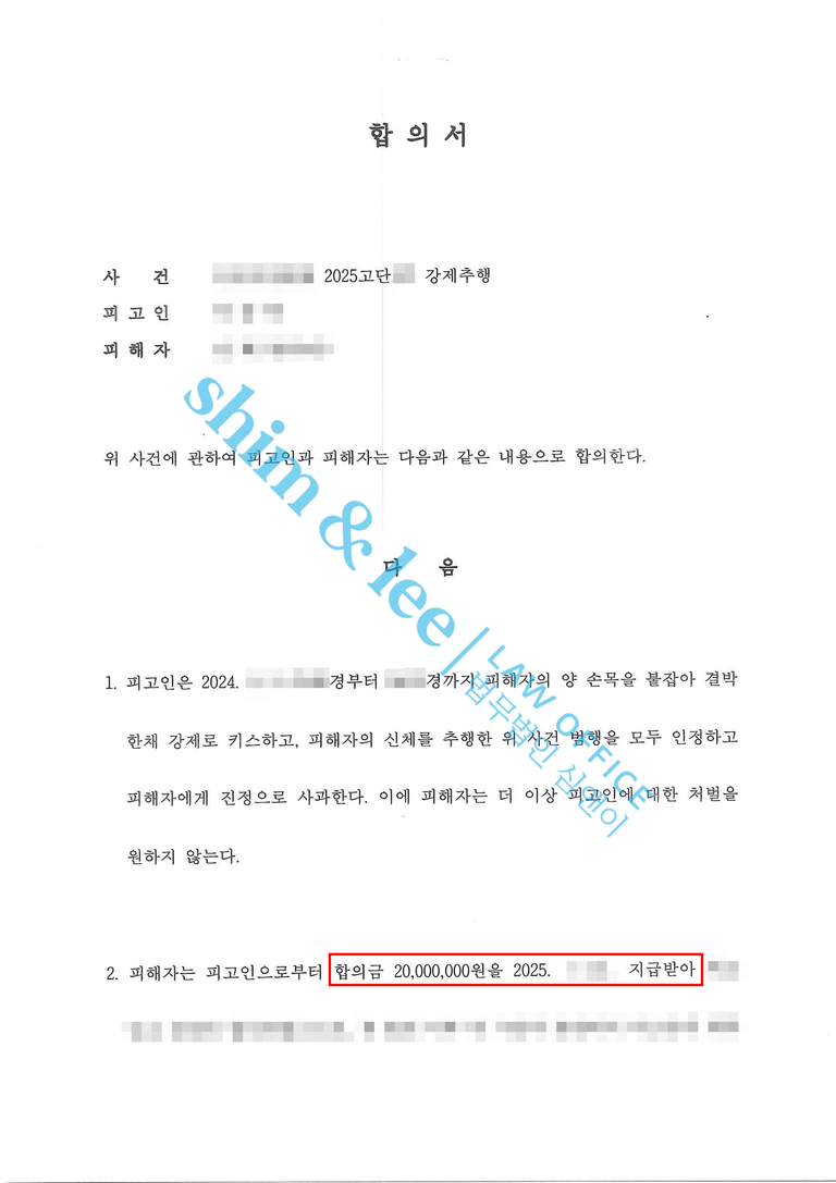- 대표 변호사님의 단호한 입장에 합의가 결렬될 것을 우려한 가해자는 자신의 범행을 인정하는 사과문을 전달하며, 처음 제시했던 금액의 두 배인 2,000만을 제시하며 합의를 간절히 요청해왔습니다. 이에 대표 변호사님은 향후 발생할 수 있는 2차 피해를 철저히 방지하기 위해, 비밀유지, 접근•보복금지, 통신제한, 소제기금지 조항을 모두 포함한 조건으로 합의를 진행하였습니다.