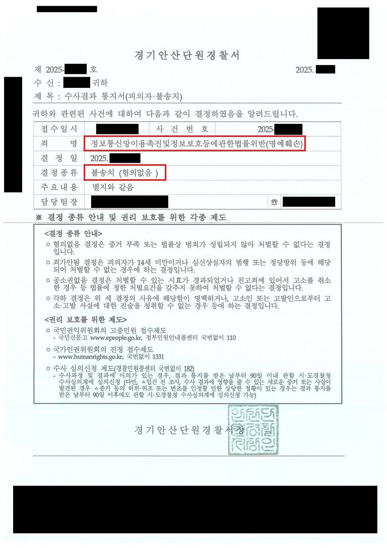 이 사건에서 수사기관은 의뢰인에게 허위 사실에 대한 인식이 없는 점, 비방할 목적이 없었던 것으로 보이는 점 등의 사정을 참작하여 불송치(혐의 없음) 결정을 내려주었습니다. 의뢰인으로서는 매우 만족스러운 결과였고, 이를 통하여 다시 빠르게 일상 생활로 복귀할 수 있었습니다.