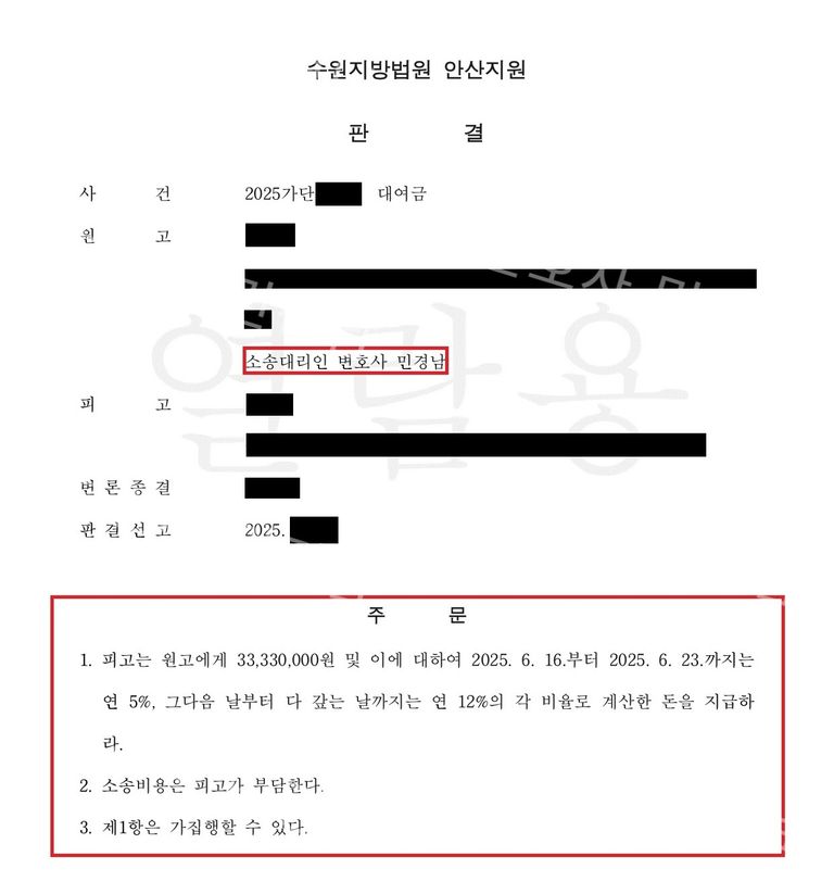 특히, 소송 과정에서 2025년 6월 9일 의뢰인과 상대방 간에 이루어진 합의 내용이 중요한 증거로 채택되었는데, 이 증거 역시 의뢰인과 함께 준비하며 수집한 것으로서 이번 소송에서 매우 중요하게 작용하였습니다.