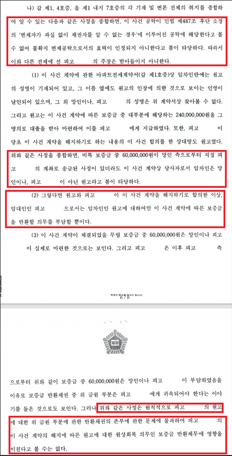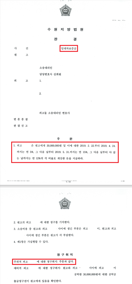 그러자 원고는 피고에게 이러한 처가 쪽의 주장은 일방적인 부당한 주장이며, 임대차 계약서 당사자도 원고 혼자 명의로 작성되었기에, 자신에게 건네줄 것을 주장하였습니다.