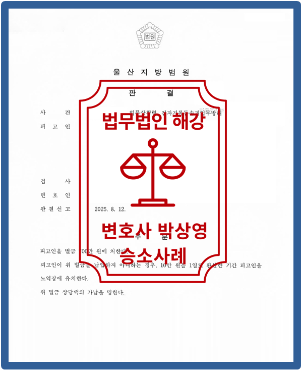 저희 법무법인 해강은 법리적인 검토를 통하여 의뢰인 상황에 맞춘 변호인 의견서 등 작성을 통하여 의뢰인을 위해 최선을 다하였고 이에 [벌금형]을 이끌어냈습니다.