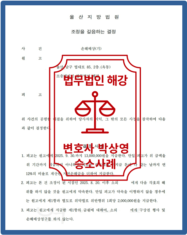 법무법인 해강에서는 법리적 검토와 준비서면 등을 통하여 의뢰인의 맞는 법률 조력을 하고자 노력하였고 [조정을 갈음하는 결정]에 성공 하였습니다.
