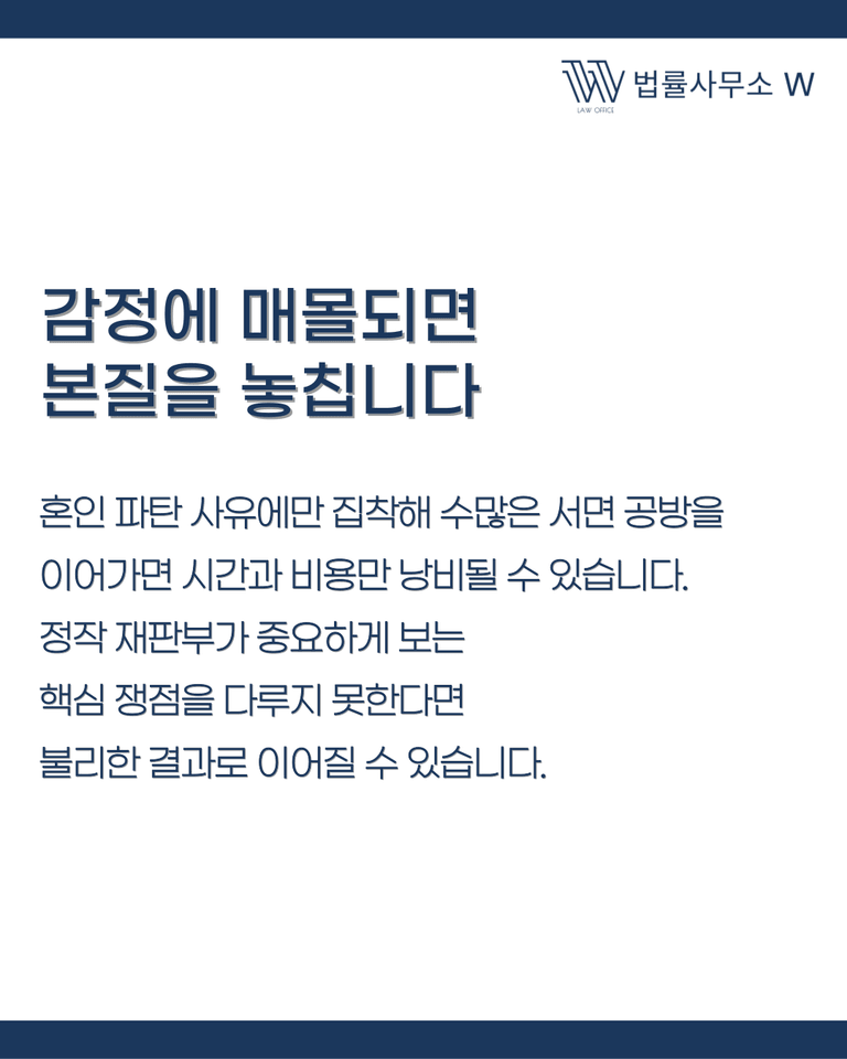 이혼 소송에서는 억울함을 호소하고 싶은 마음이 클 수밖에 없습니다. 그러나 감정적 대응에만 매달리면 사건의 본질이 흐려지고, 시간과 비용이 불필요하게 소모됩니다.