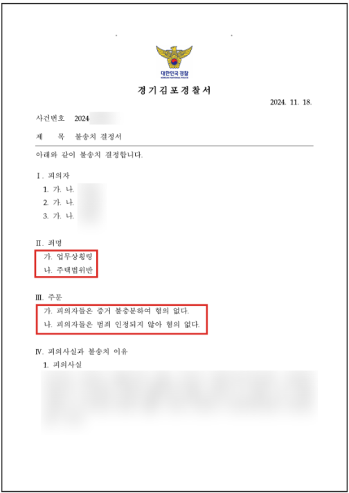 수사기관은 이상과 같은 법률사무소 송지의 주장을 받아주셨고, 의뢰인들에 대해 제기된 업무상횡령, 주택법위반 혐의에 대해 불송치결정을 내려주셨습니다.