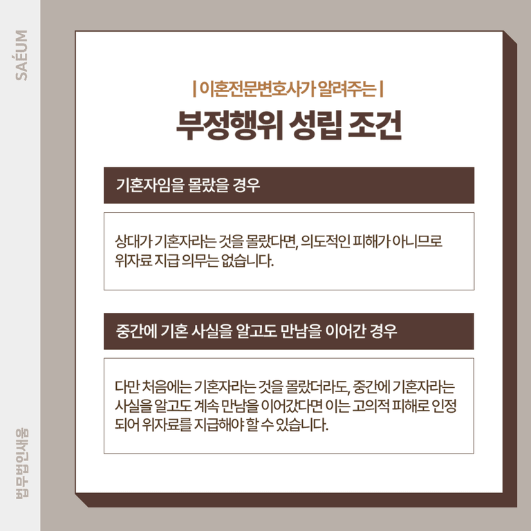 다만 처음 만날 때는 기혼자임을 몰랐더라도, 중간에 기혼자라는 사실을 알게 된 이후에도 계속 만남을 이어갔다면 이는 고의적 피해로 인정되어 위자료를 지급해야 할 수 있습니다.