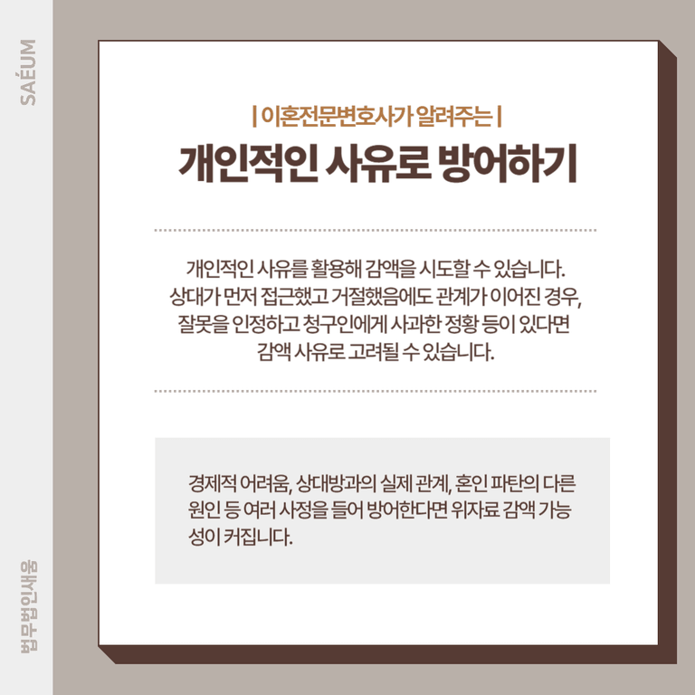 또한 경제적 어려움, 상대방과의 실제 관계, 혼인 파탄의 다른 원인 등 여러 사정을 들어 방어한다면 위자료 감액 가능성이 커집니다.