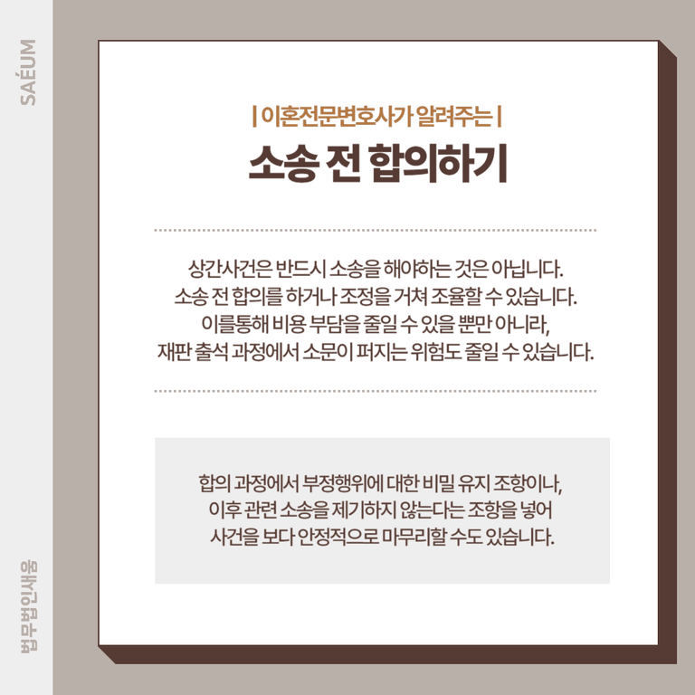 상간소송은 반드시 재판으로만 결론이 나는 것은 아닙니다. 소송 전 합의를 하거나 조정을 거쳐 조건을 조율하는 방법도 있습니다. 합의나 조정으로 진행하면 소송 비용 부담을 줄일 수 있을 뿐만 아니라, 재판 출석 과정에서 소문이 퍼지는 위험도 줄일 수 있습니다.