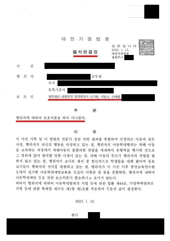 이 사건 의뢰인은 현직 중학교 교사로 아동학대 행위는 경미하지만 아동보호사건으로 진행되어 처분이 결정될 경우 이를 근거로 징계가 진행되므로 반드시 불처분 결정을 받기를 원하였습니다.