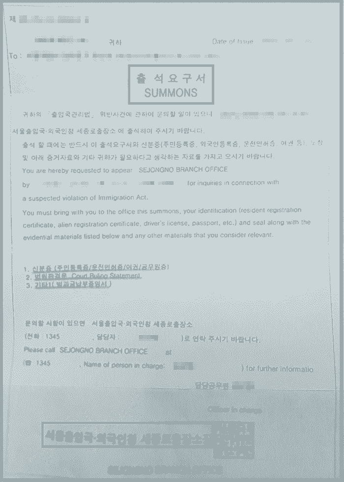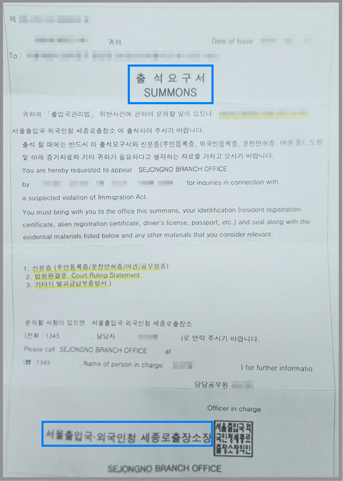 이후 의뢰인은 출입국·외국인청으로부터 사범심사에 출석하라는 출석요구서(Summons)를 받은 의뢰인은 외국인의 경우 일정 수준 이상의 형사처벌을 받게 되면 강제 출국을 당하거나 비자 갱신이 거절될 수 있다는 것을 알고 변호인을 찾아왔습니다.