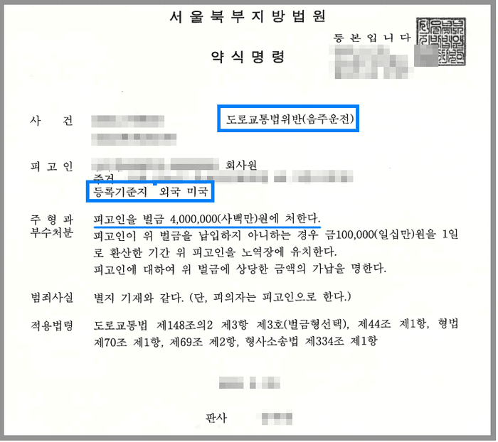 의뢰인은 재외동포비자(F-4)로 국내에 체류하면서 회사에 다니고 있던 사람이었는데 혈중알코올농도 0.066%의 술에 취한 상태로 약 6km를 음주운전 하였다는 혐의로 적발되어, 벌금 400만원의 처벌을 받게 되었습니다.