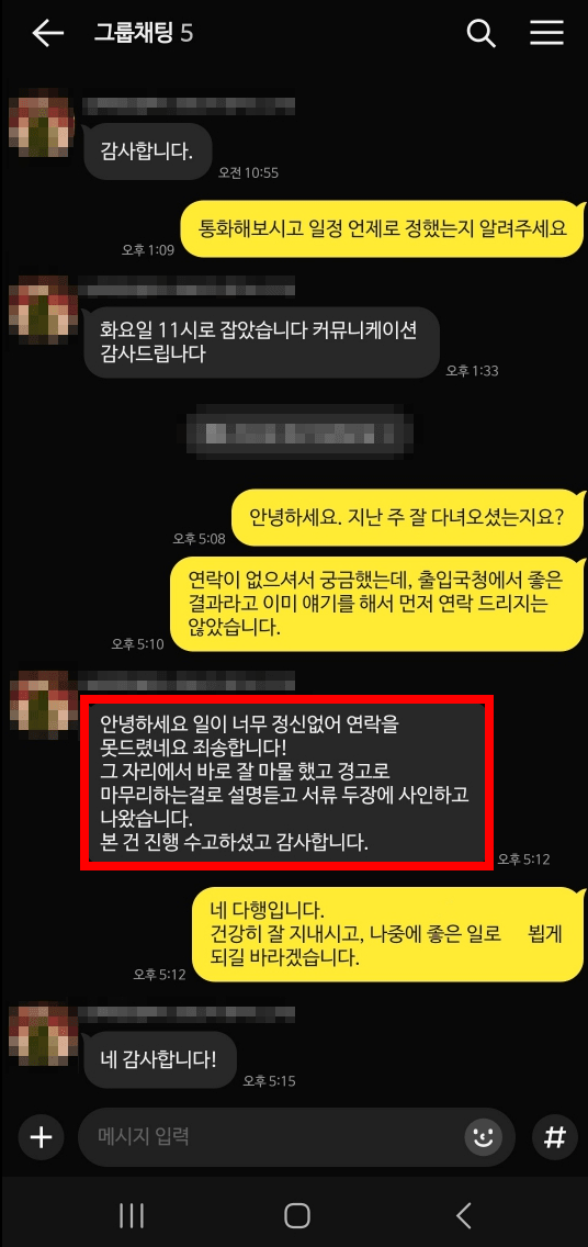 그리고 사범심사 당일 직접 의뢰인과 함께 출입국·외국인청에 출석하여 무사히 조사를 마칠 수 있도록 의뢰인을 조력했습니다.