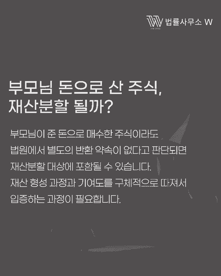 오늘은 부모님이 준 돈으로 산 주식이 재산분할 대상이 되는지 문제 된 사건에서, 부모님이 준 원금은 지키고 주식 가치 상승분 일부만 재산분할 대상으로 인정받았던 실제 사례를 소개해 드리겠습니다.