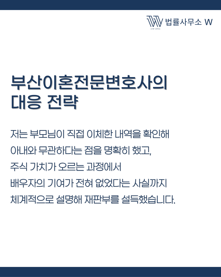 저는 사건 초기부터 주식 매수 자금의 출처를 명확히 밝히는 데 집중했습니다. 은행 이체 내역을 통해 이 돈이 부모님으로부터 직접 증여된 사실을 입증했고, 주식 운용과 가치 상승 과정에서 아내의 기여가 없었다는 점을 구체적으로 정리했습니다.