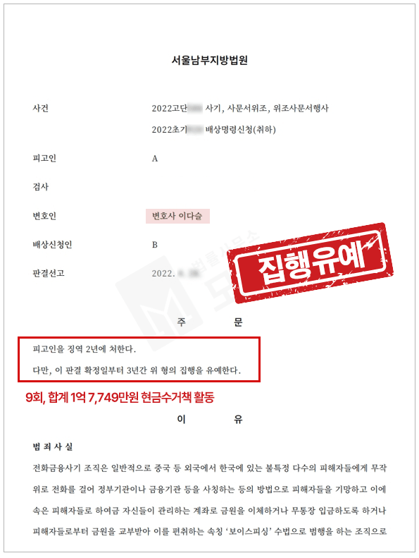 그러나 피고인이 적극적으로 수사에 협조하였고, 함께 활동하던 조직원 검거에도 기여한 점, 피해자들과 합의한 점, 초범인 점 등이 양형에 유리하게 반영됨에 따라 집행유예로 선처를 받을 수 있었습니다.