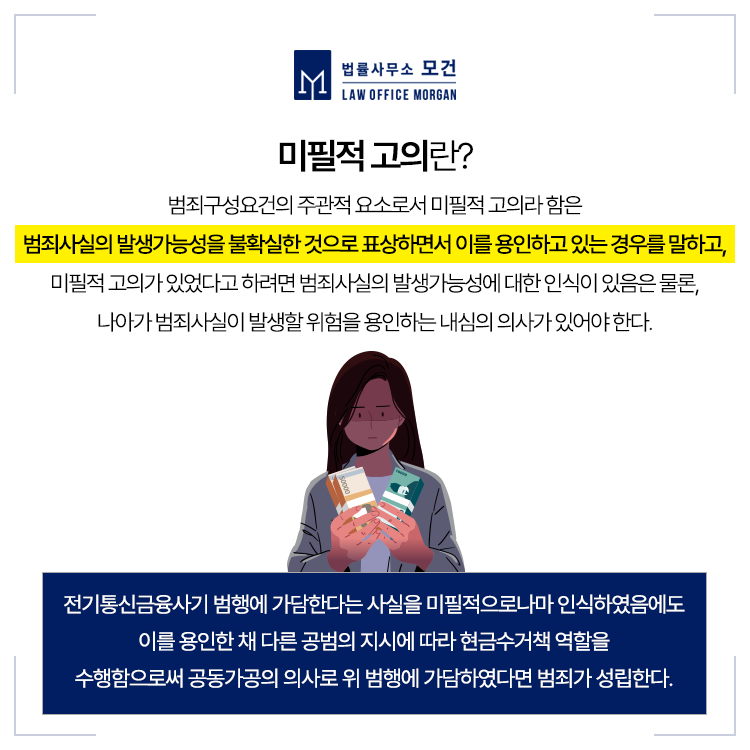 이러한 분들의 경우 '범죄인줄 몰랐다'며 혐의를 부인하는 경우가 많은데, 우리 법원은 미필적 고의에 의한 인식도 범죄라 보고 있기 때문에, 쉽게 혐의에서 벗어나기 어렵습니다.