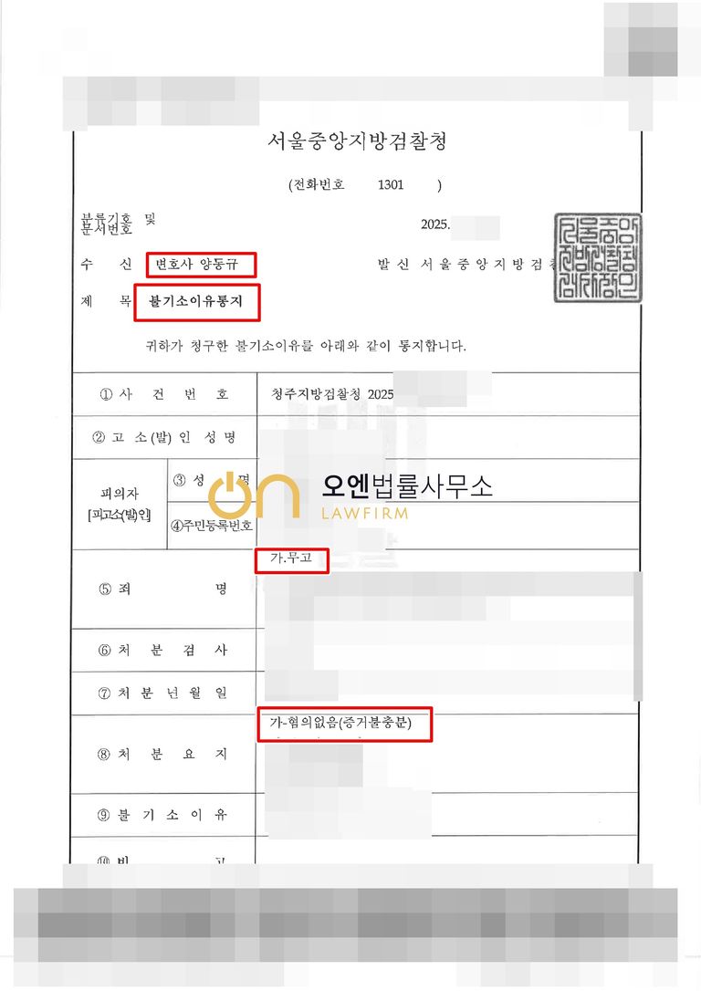 검찰은 담당변호사의 주장을 받아들여, 혐의없음(증거불충분)의 불기소처분을 하였습니다.