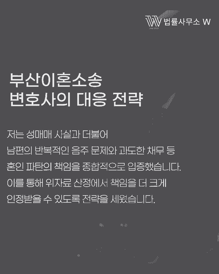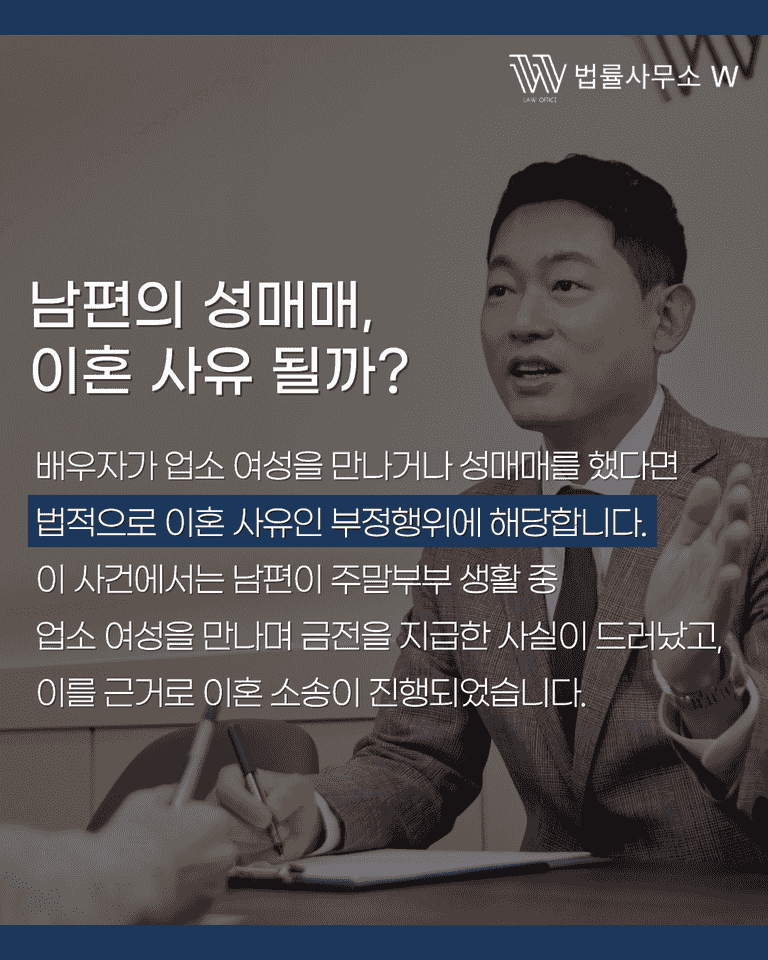 의뢰인은 부산에 거주하는 30대 여성으로, 주말부부 생활 중 남편이 업소 여성을 만나 성매매를 한 사실을 알게 되어 이혼을 결심했습니다.