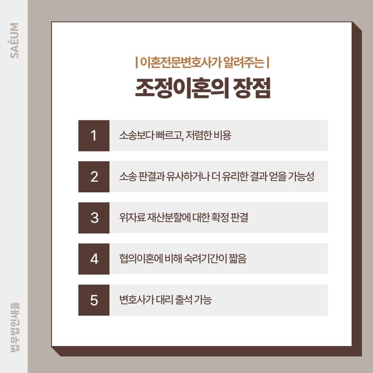 사실 배우자 외도 이혼의 경우 혼인파탄의 사유가 명확하기 때문에 유책배우자 입장이 아닐 경우에는 소송을 통해서도 헤어지는 것이 가능합니다. 그럼에도 불구하고 조정을 시도하게 되는 것에는 몇 가지 이유가 있는데요.