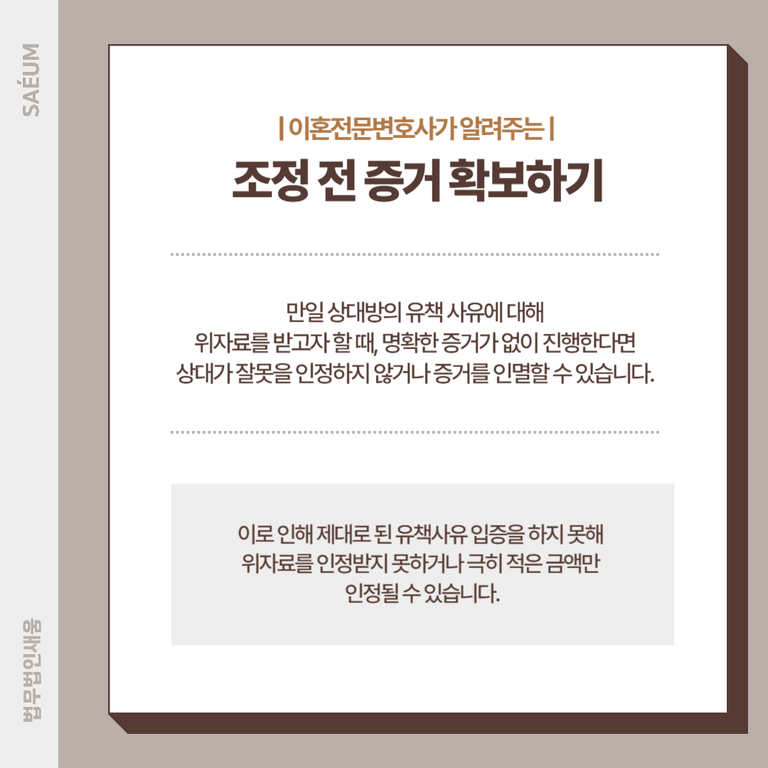 만일 증거를 확보하지 않고 조정을 하다가 소송으로 이어지게 되는 경우 이미 상대방이 증거가 될 만한 것들을 모두 인멸했을 가능성이 높으며, 이로 인해 제대로 된 유책사유 입증을 하지 못해 위자료를 인정받지 못하거나 극히 적은 금액만 인정될 수 있습니다. 따라서 이혼 조정을 시도할 때에도 그 전에 미리 증거부터 확보하여 이어질 상대방과의 합의나 소송에 대비해 보시는 것이 좋습니다.