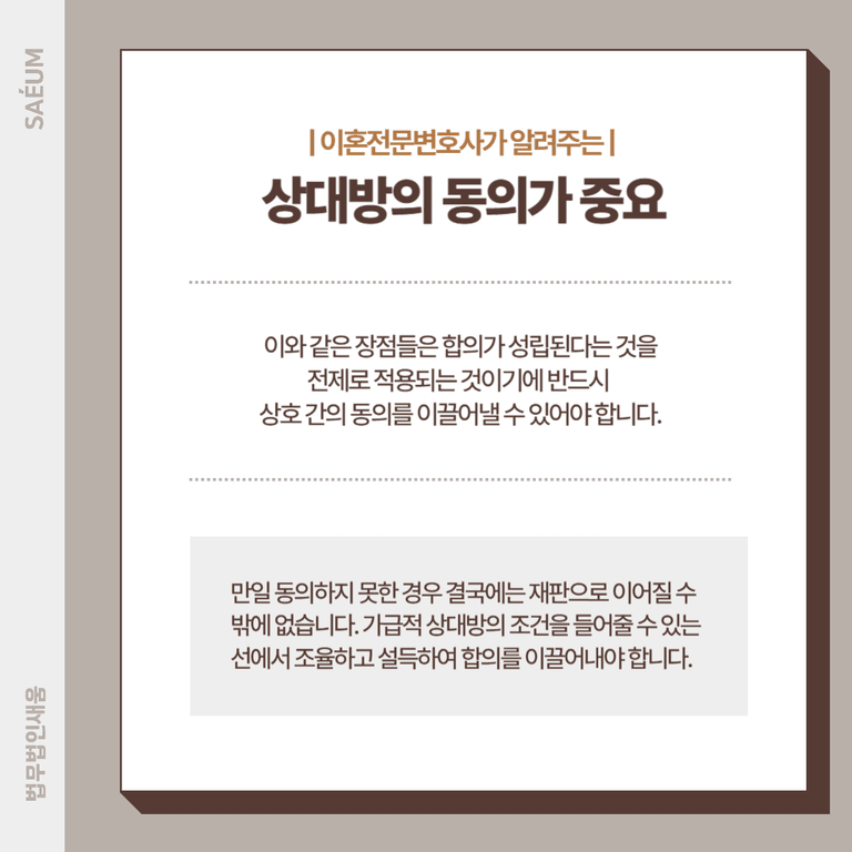 이혼 조정은 여러모로 유리한 부분들이 많습니다. 하지만 이와 같은 장점들은 합의가 성립된다는 것을 전제로 적용되는 것이기에 반드시 상호 간의 동의를 이끌어낼 수 있어야 합니다.
