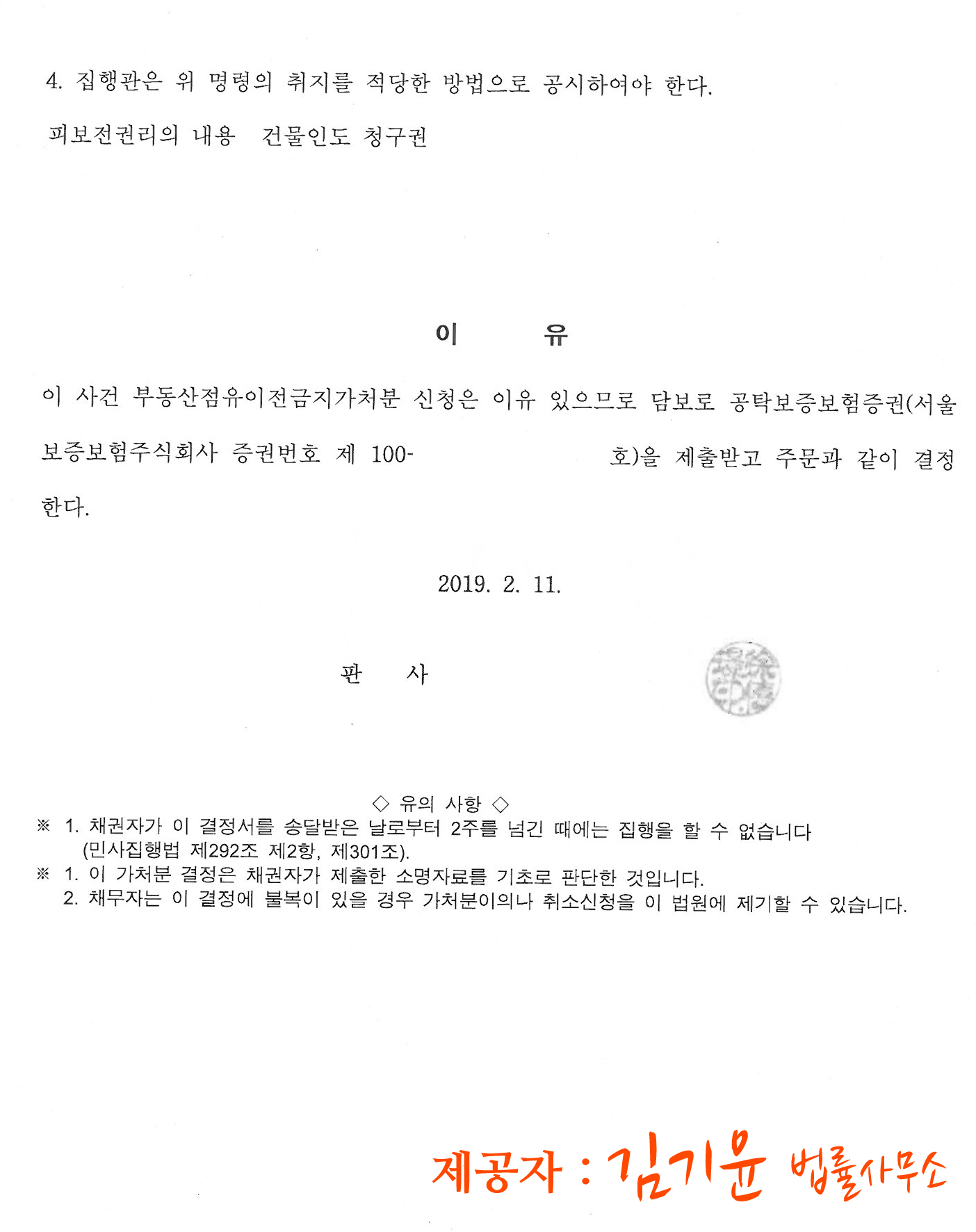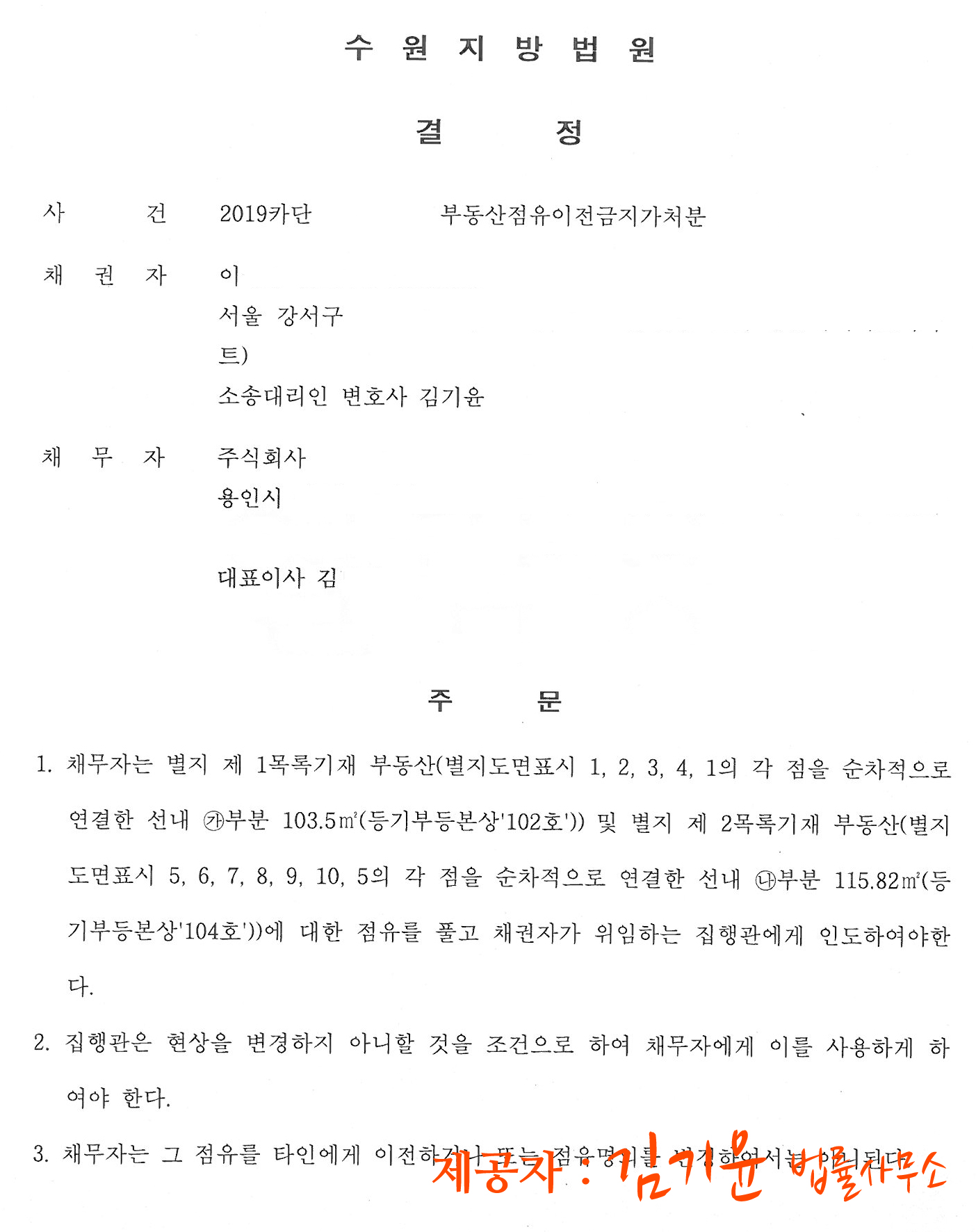 3. 채무자는 그 점유를 타인에게 이전하거나 또는 점유명의를 변경하여서는 아니된다. ◁◀ 이 결정이 아주 중요합니다. 이 주문결정을 반드시 받아야 합니다.