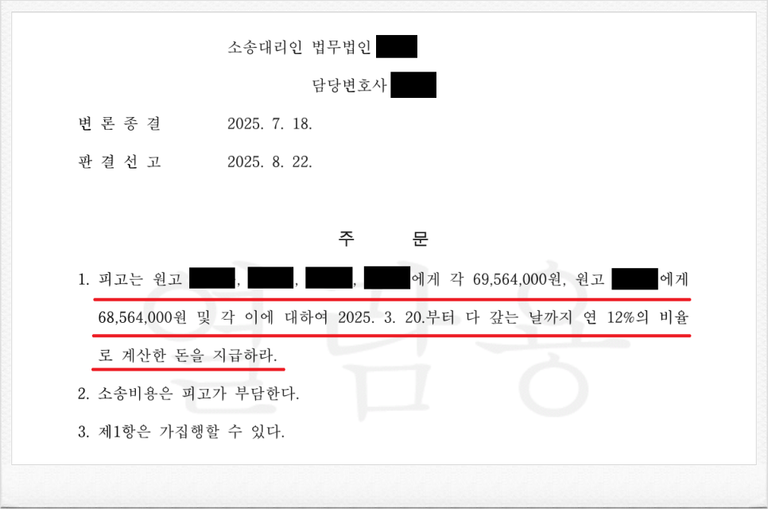 결국 재판부는 이러한 저의 주장을 받아들여, 피고가 의뢰인들에게 각 납입금 및 이에 대한 지연손해금을 지급하라는 내용의 판결을 선고하였습니다.