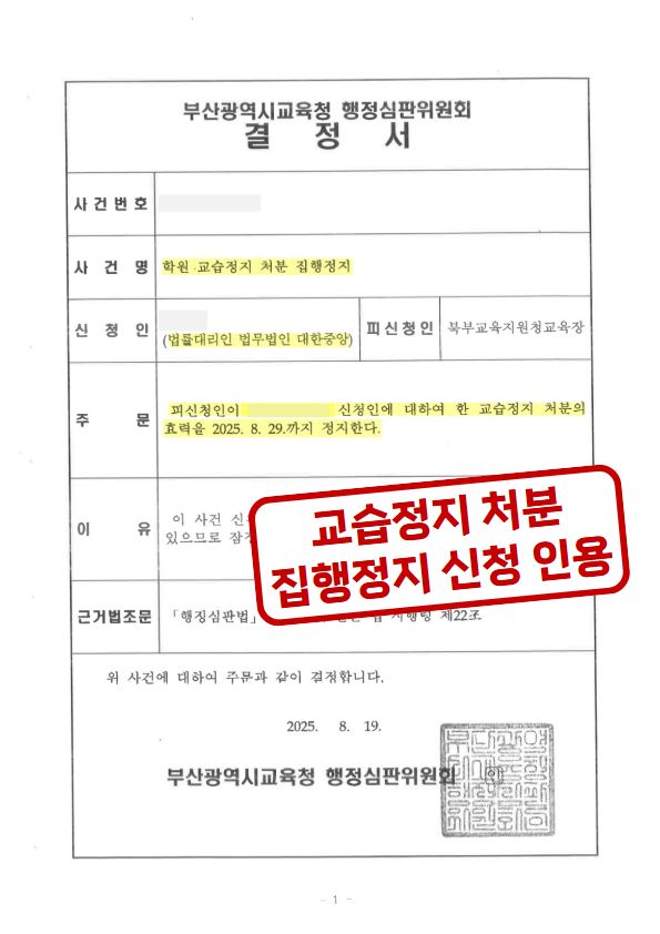 그 결과 이동규 변호사의 신청이 인용되어 행정처분의 집행이 정지되었습니다. 의뢰인 A씨는 사건이 마무리될 때까지 학생들과 수업을 이어갈 수 있었습니다.