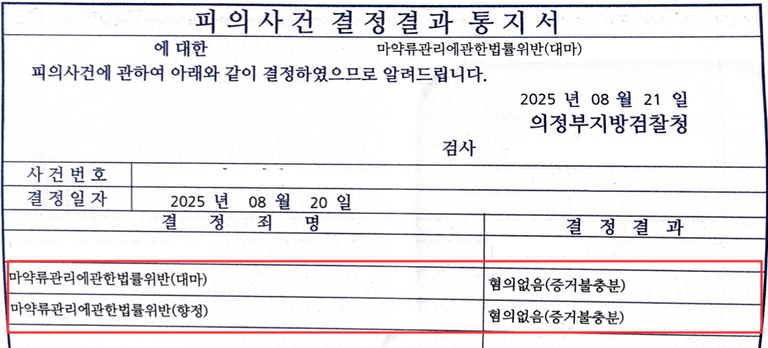 검찰은 변호인의 주장을 받아들여,마약류관리법위반(향정) 공동관리 혐의에 대해서 혐의없음(증거불충분) 처분을 내렸습니다.