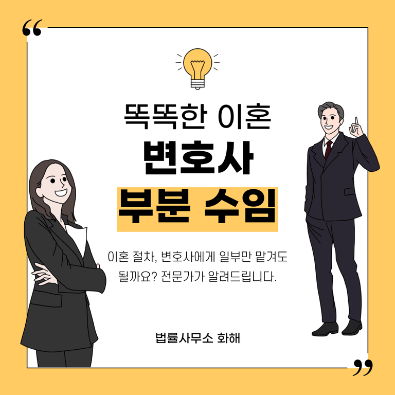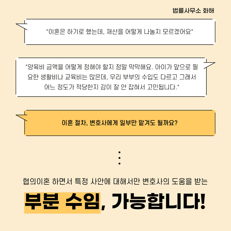 이처럼 현실적으로도 복잡한 이혼 사안에서는 모든 과정을 변호사에게 일임하기보다는, 필요한 부분만 부분적으로 수임하여 효율적이고 합리적인 해결책을 찾는 방법이 있습니다.