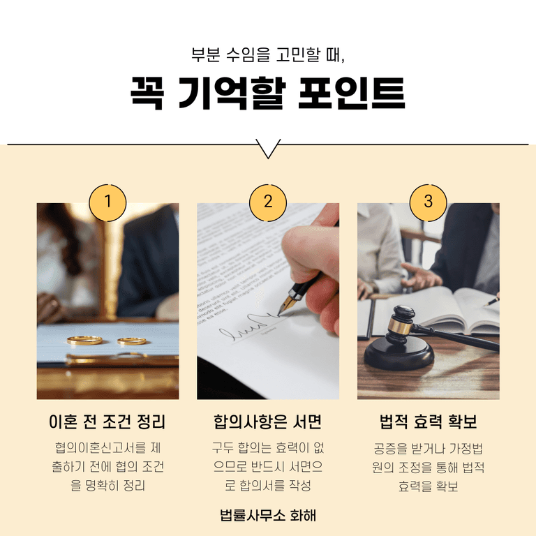 현재 부분 수임을 고려하고 있다면, 협의이혼 신고서(의사확인서)를 제출하기 전에 재산분할, 양육비, 위자료와 같은 조건을 최대한 구체적으로 정리해 두는 것이 바람직합니다. 이혼 절차가 완료된 뒤에는 상대방이 “이미 이혼했으니 더 이상 협조할 필요가 없다”는 태도로 돌아설 수 있기 때문입니다.