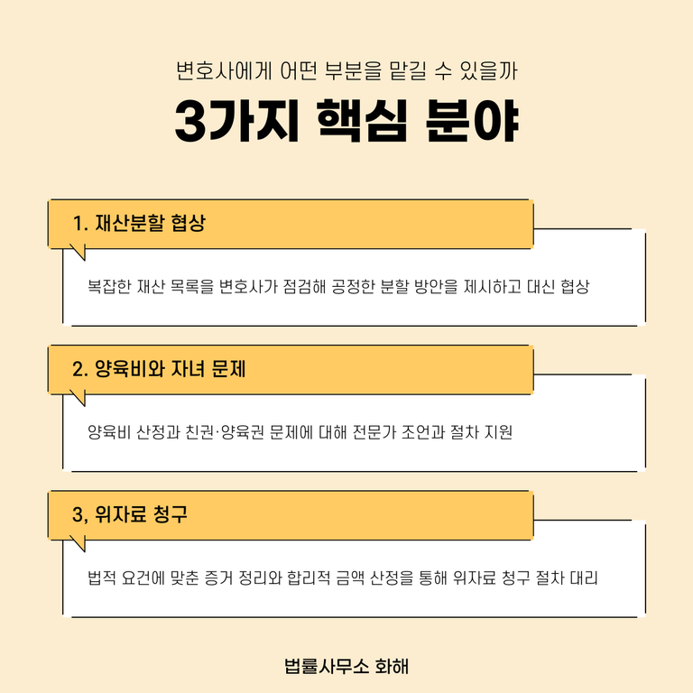 예를 들어, 재산 규모가 크거나 복잡하여 재산분할 협상만 변호사에게 의뢰할 수도 있고, 자녀의 나이·양육 환경·부모의 소득 수준에 따라 양육비 계산이 복잡한 경우에는 양육비 산정 부분만 전문가 도움을 받을 수도 있습니다. 또한 상대 배우자의 외도나 폭력 등으로 인한 위자료 청구만 별도로 진행하는 것도 가능합니다.