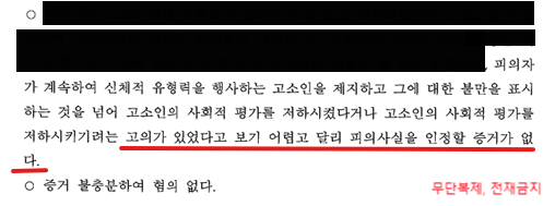 "피의자의 발언이 고소인을 제지하고, 그에 대한 불만을 표시하는 것을 넘어 고소인의 사회적 평가를 저하시켰다거나, 저하시키려는 고의가 있었다고 보기 어렵고 달리 피의사실을 인정할 증거가 없다"