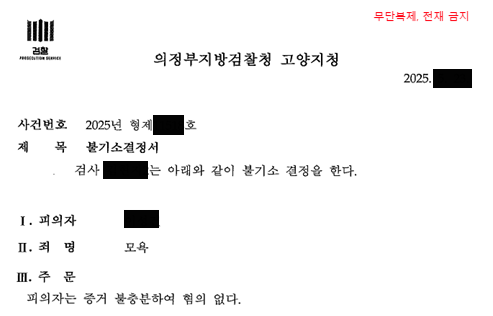 결국 의뢰인은 혐의없음(불기소) 결정을 받고 형사처벌의 위험에서 완전히 벗어났습니다.