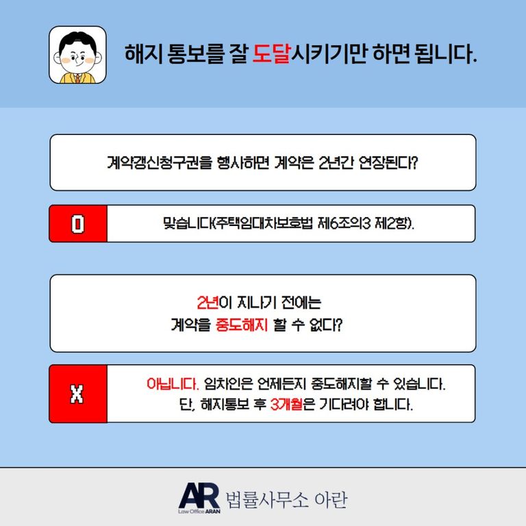 따라서 임차인은 임대인에게 계약해지의 의사를 정확하게 '도달'시켜야 하고, 이와 관련한 증거를 수집해 두어야 합니다.