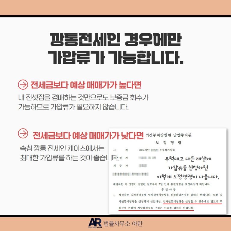 반면에 내가 살던 집을 경매로 팔아도 내 전세금을 받아내지 못하는 케이스라면 가압류가 필요합니다.