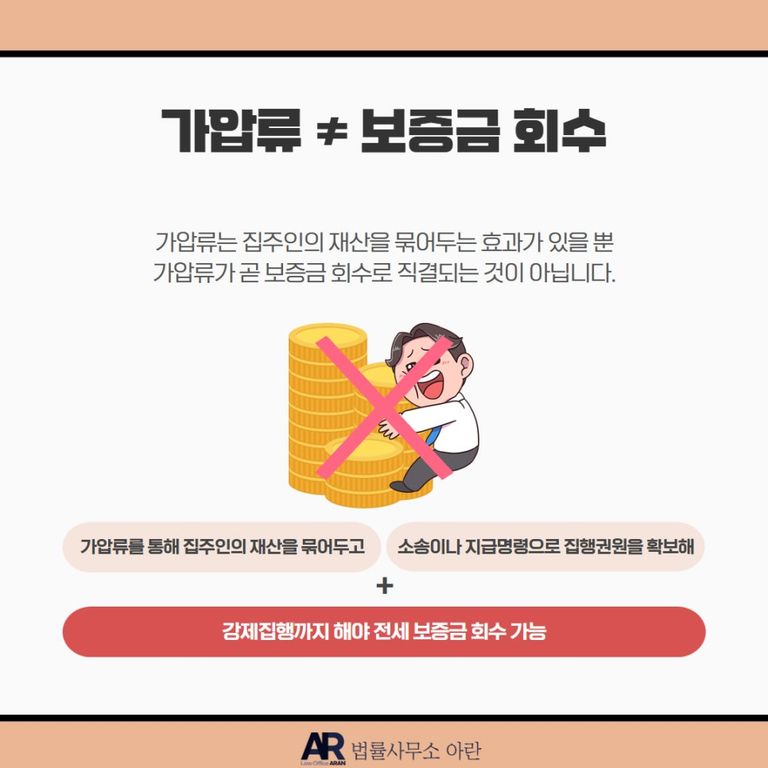 가압류는 '보증금 반환 청구 소송을 하는 동안에 집주인이 재산을 빼돌리지 못하도록 하는 조치'에 불과합니다.