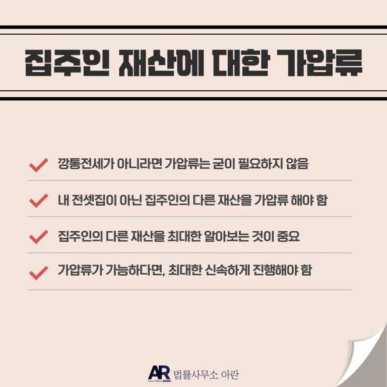 집주인의 다른 재산에 대한 가압류를 함으로써 "내가 전세금 대신 이 집을 떠안는 일은 절대 없을 것이다"라는 명확한 경고를 하는 것이지요.
