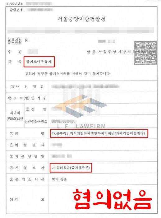 LF 변호인은 의뢰인의 진술과 촬영물을 근거로, 문제가 된 사진이 특정 신체 부위를 대상으로 한 것이 아니며 성적 욕망 또는 수치심을 유발할 수 있는 촬영물에 해당하지 않음을 입증하였습니다. 또한 의뢰인이 현장에서 촬영을 하였으나 카메라등이용촬영죄의 구성요건상 범죄가 성립하지 않는다는 법리를 명확히 제시하였습니다. 담당 검사와의 면담을 통해 의견서의 논지를 상세히 설명하고, 무혐의 처분이 타당함을 적극 주장하였습니다.