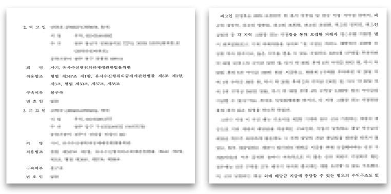 수사기관은 박OO씨를 단순 투자자가 아니라, ‘서울 지역 본부장’이라는명칭을 붙여, “총책의 오른팔격인 관리자급 공모공동정범”으로 판단하고 기소 의견으로 송치했습니다. 총책이 구속되었기에, 이 사건은 엄청난 규모를 가진 사건(피해자는 몇백 명에 달하였고, 총 피해액도 매우 큰 액수였습니다)치고는 비교적 신속하게 구공판으로 넘겨졌습니다.