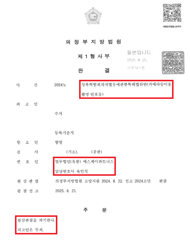 이러한 저의 조력을 바탕으로 A씨는 무릎을 꿇고 빌고 휴대전화를 한강에 버려 1심에서 유죄판결을 선고받았음에도 불구하고 항소심에서는 1심 유죄판결을 파기하고 무죄판결을 선고받음으로써 어떠한 전과기록도 남기지 않을 수 있었습니다.