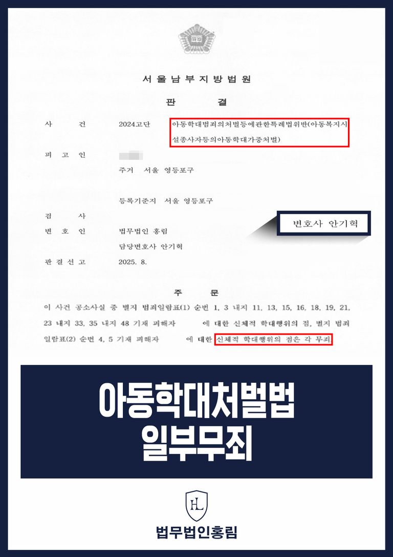 그 결과, 재판부는 의뢰인의 지속적인 신체적 학대 혐의에 대해 인정할 만한 상당한 증거가 없다고 보고 일부 무죄 판결을 내렸고, 그 결과 의뢰인은 실형을 면할 수 있었습니다.