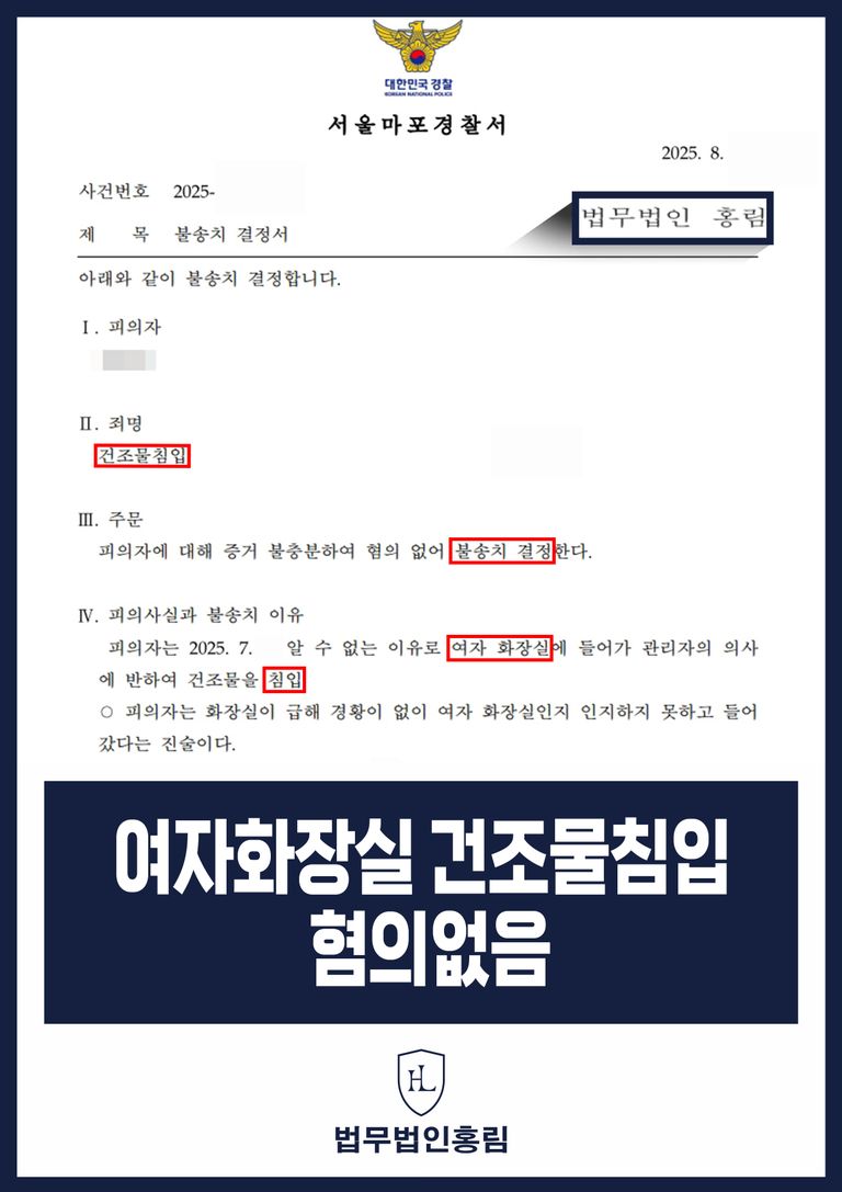 변호인의 체계적인 법률 방어와 체계적인 변호 덕분에, 경찰은 의뢰인이 성적 목적을 가지고 여자화장실에 침입했다는 혐의에 대해 혐의없음(증거불충분)으로 판단하고 불송치 결정을 내렸습니다.