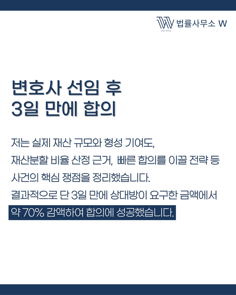이후 상대방 변호사와 직접 협상에 나섰습니다. 의뢰인의 가장 큰 목표는 재산분할 금액을 최대한 줄이고 빠르게 사건을 마무리하는 것이었습니다. 그 결과 단 3일 만에 합의 조건을 도출했고, 상대방이 청구한 금액에서 약 70% 가까이 감액된 금액으로 조정안을 마련할 수 있었습니다.