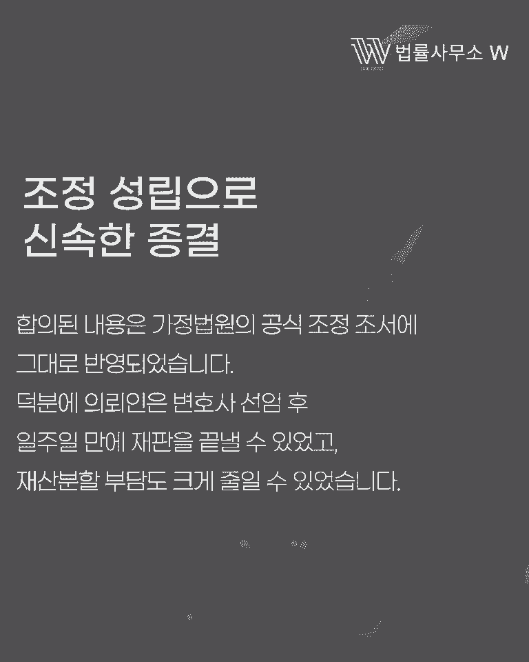합의된 내용은 가정법원의 공식 조정 조서에 그대로 반영되었습니다. 덕분에 의뢰인은 변호사 선임 후 단 일주일 만에 조정이 성립되어 이혼 절차를 마무리할 수 있었고, 불필요하게 긴 소송 과정과 감정 소모를 피할 수 있었습니다.