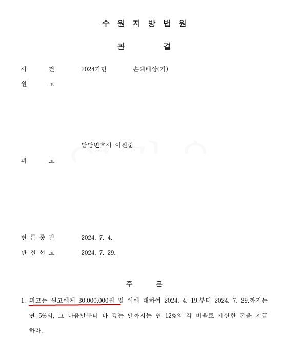 위와 같은 조력의 결과 피고의 주장들은 모두 배척되었고, 피고와 의뢰인 아내의 부정행위는 인정되었습니다. 그 결과 이례적으로 피고가 의뢰인에게 사실상 청구한 위자료 3,000만 원 전액을 지급하라는 원고 승소 판결을 받을 수 있었습니다.